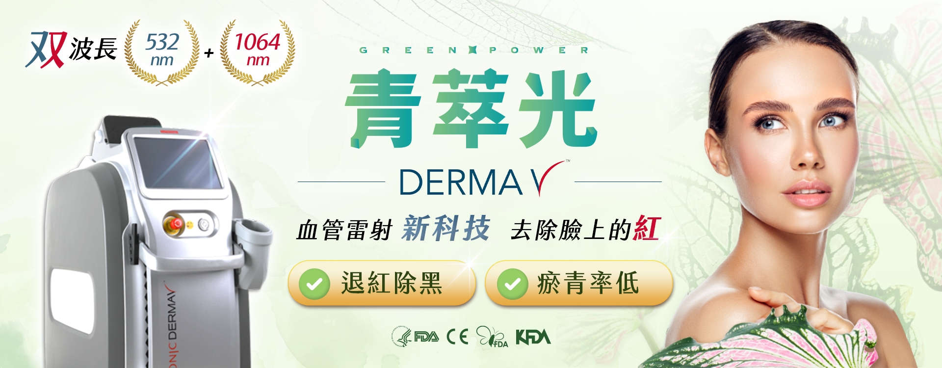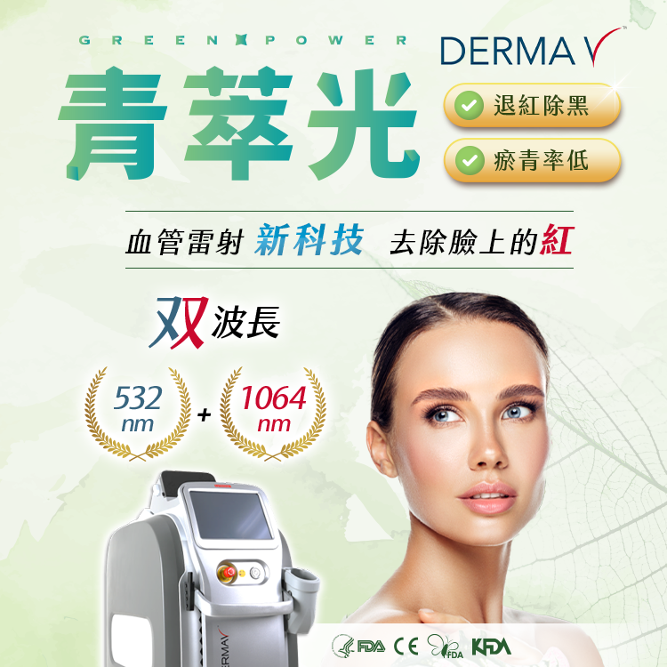 血管雷射新選擇 青萃光DermaV ("核准名稱:璐霓可德瑪雷射系統"),為目前可針對血管型病變問題的進化型血管雷射。其中升級的532nm雷射波長將比傳統雷射波長的含氧血紅素吸收度更佳,可以以更溫和的能量就能擁有更加理想的血管型病變治療效果。