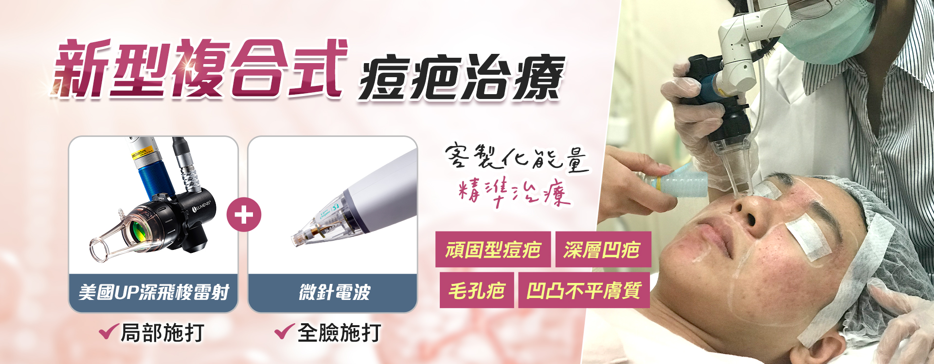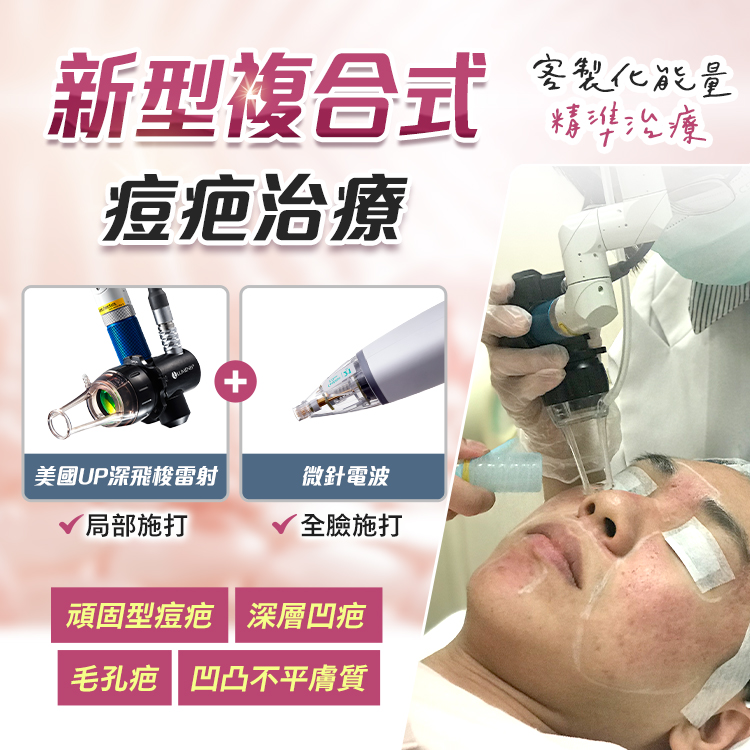 複合式痘疤治療治療關鍵在於對的深度及位置,給予精準足夠的能量,提高治療痘疤滿意度並有效縮短痘疤雷射恢復期。