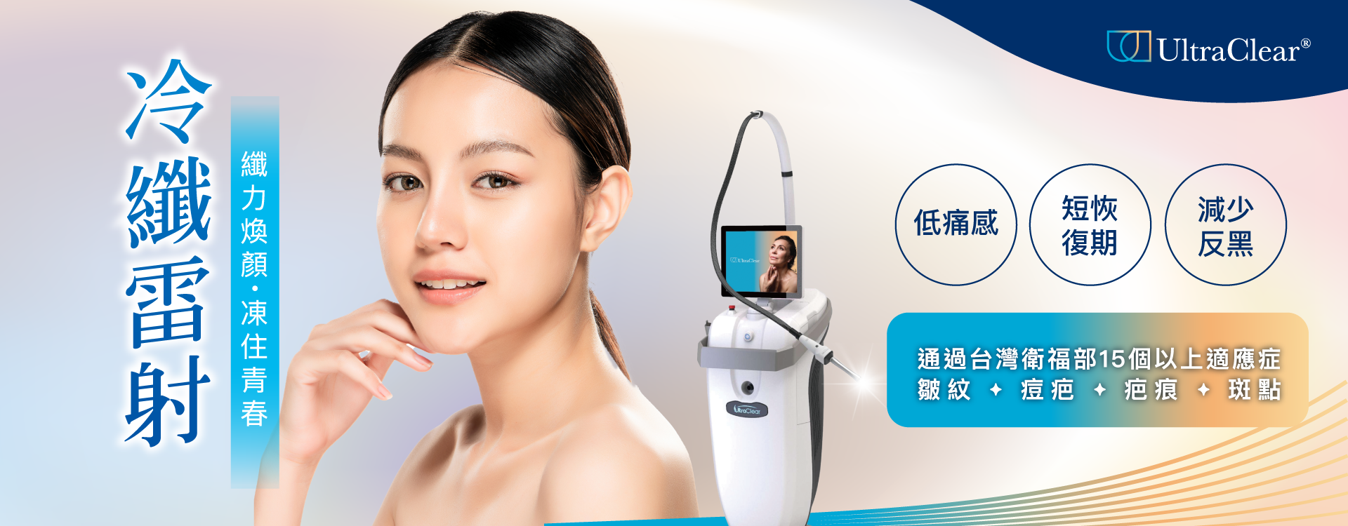 注意事項: 1.體內裝有⼼律調節器、光敏感、服用特殊藥物患者、心臟病、糖尿病、高血壓、皮膚感染的患者及孕婦和哺乳婦女、具有單純皰疹、自體免疫疾病、急性疾病、高血壓、糖尿病、癲癇患者、最近三個月內接受過臉部磨皮手術、臉部換膚或深層化學換膚的患者等族群不適合使用冷纖雷射("核准名稱:艾克羅奧創克爾雷射系統“Acclaro”UltraClear Fractional Laser System ")治療,治療前請先經由專業醫師診斷。 2.治療過程請密切配合醫師指示並做好術後照顧。 3.術後避免使用含有去角質、酸類、美白、酒精等成分的護膚品,並避免用熱水洗臉。配合醫師指示術後2週內避免高溫場所並做好術後照顧,外出請務必做好防曬。 4.先前進行雷射、肉毒、針劑,請間隔 4-6 週 |